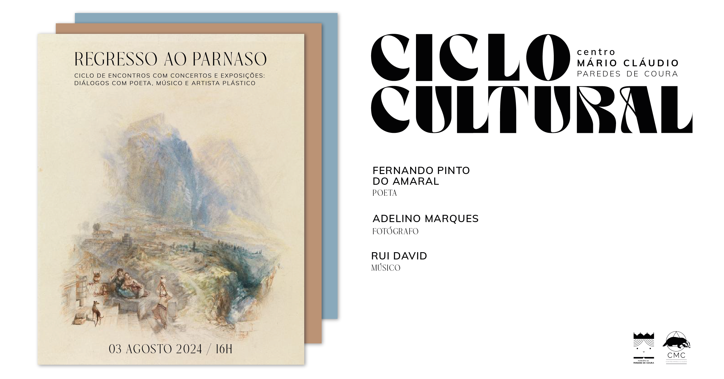 O Centro Mário Cláudio promove, em Venade (Paredes de Coura), no próximo dia 3 de agosto, sábado, 16h00, uma nova sessão do Ciclo “Regresso ao Parnaso”. Desta vez, a sessão conta com a participação de três artistas – Fernando Pinto do Amaral (poeta), Adelino Marques (fotógrafo) e Rui David (músico). Com estes importantes convidados, será certamente uma bela conversa, em tempo agradável de férias!